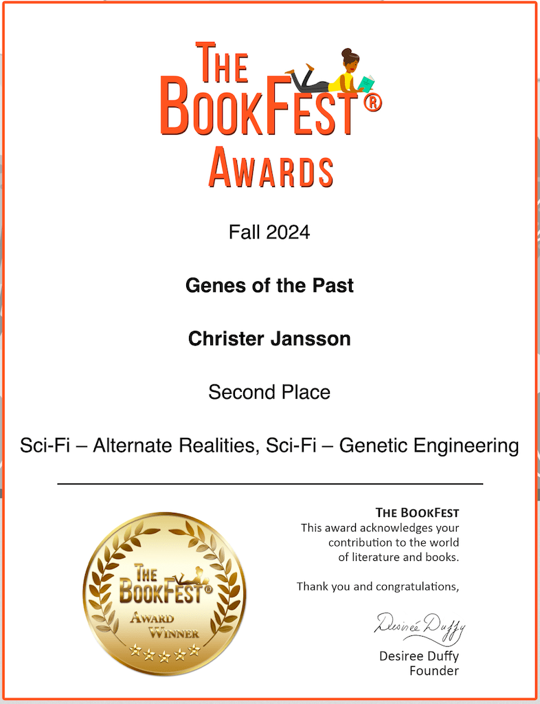Genes of the Past was selected as one of six winners, out of 50 contestants, for the February 2025 International Impact Book Award in the science fiction / speculative fiction category.